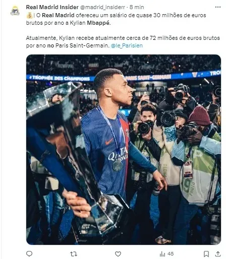 O jovem atacante francês, de 25 anos, é um desejo antigo do Real Madrid, que tenta sua contratação há dois anos. Apesar das tentativas anteriores, o PSG conseguiu resistir às investidas do clube espanhol. No entanto, com a notícia de que Mbappé não renovará seu contrato e provavelmente deixará o clube de graça ao final da temporada, a situação mudou drasticamente.