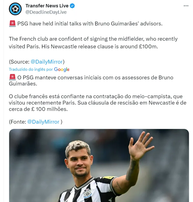 Ciente do interesse da dupla Real Madrid e Barcelona, o PSG intensificou o interesse no futebol do brasileiro Bruno Guimarães, do Newcastle e, hoje, lidera a corrida contra Barça e Real Madrid.