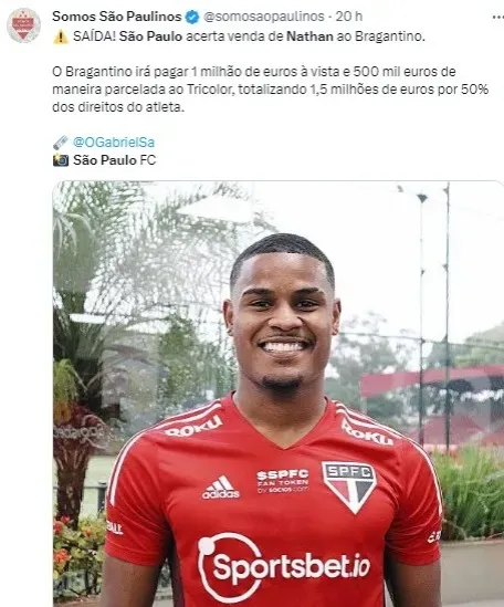 Vale destacar que o São Paulo mantém 40%, uma vez que originalmente detinha 90% dos direitos, enquanto os 10% restantes pertencem ao próprio Nathan.