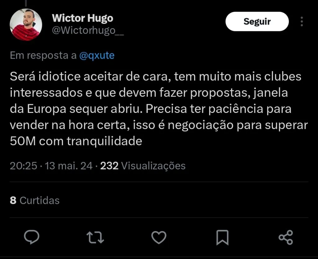 Até o momento, não há uma resposta oficial por parte do Rubro-Negro Pernambucano. O clube ainda analisa o investimento, e espera poder adquirir o máximo possível de uma venda do seu lateral direito.