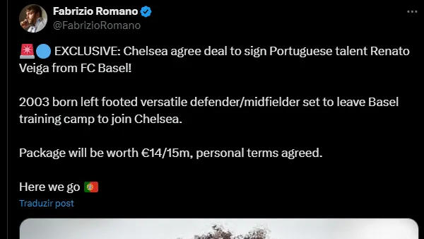 “O versátil zagueiro/meio-campista canhoto nascido em 2003 deve deixar o campo de treinamento do Basel para ingressar no Chelsea. O pacote terá o valor de € 14/15m, condições pessoais acordadas”, acrescentou.