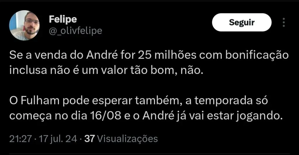 André não dificultou as negociações e deixou claro seu desejo em poder ir para a Europa nesta janela. O meio-campista tinha um sonho de atuar na Premier League, e os dirigentes do gigante das Laranjeiras sabiam disso.