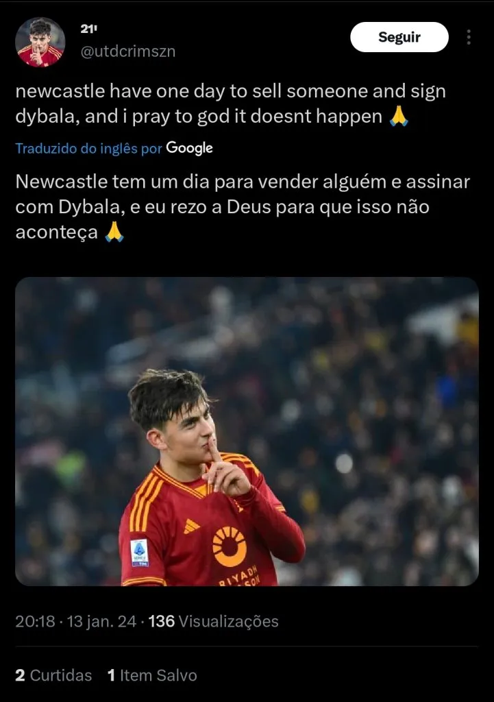 Para realizar a sua chegada, os Magpies pretendem pagar o valor da multa contratual de Paolo Dybala. No momento, a rescisão está em cerca de €11 milhões de euros.