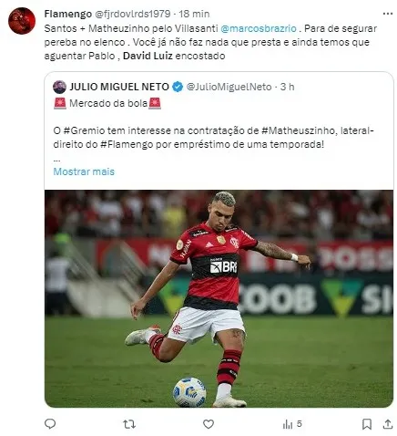 Além disso, não descartou a possibilidade de David Luiz deixar o clube, apesar da renovação automática de seu contrato. Segundo o comentarista, o Flamengo estaria construindo sua equipe não apenas com investimento financeiro, mas também com estratégia e visão.