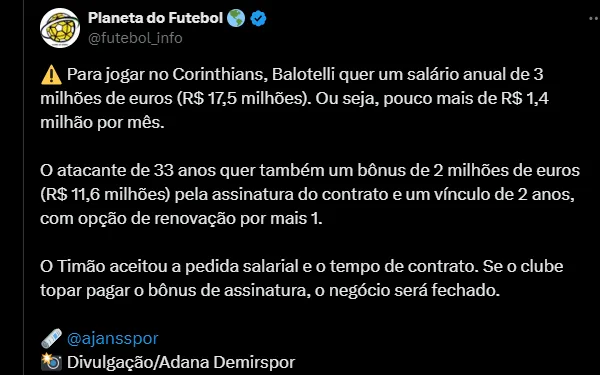 Balotelli quer ter luvas de 2 milhões de euros (R$ 11,6 milhões na cotação atual). Ainda não se sabe se o montante será diluído nos vencimentos ou será pago à vista, sendo o detalhe que impede o avanço de momento.