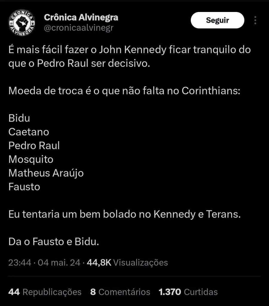 O setorista Iago Freire informa que o Corinthians estuda a possibilidade de avançar pela contratação de John Kennedy.