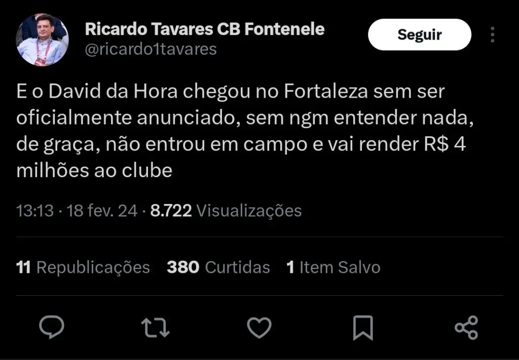 O jornalista Rogério Scarione informa que o Coritiba acertou a contratação do atacante David Da Hora, que pertencia ao Fortaleza.