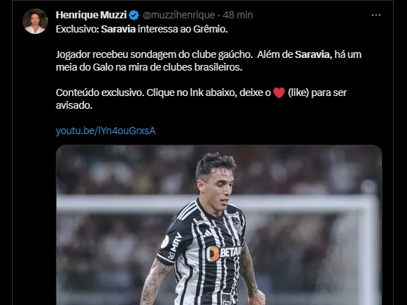 Anteriormente, já haviam sido noticiadas as atualizações de Deyverson e Bruno Rodrigues. Agora, o lateral-direito Saravia é a bola da vez.