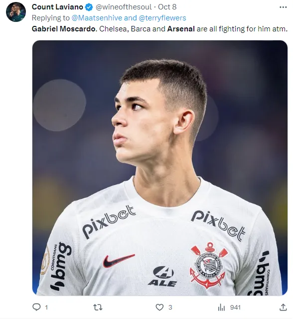 Vale lembrar que o nome de Moscardo também está no radar do Barcelona, da Espanha, Manchester City e Chelsea, da Inglaterra. O jogador possui contrato com o Corinthians até 2026.