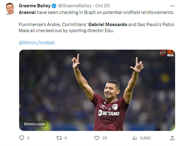De acordo com o 90min, o clube de Londres procura um possível substituto para Thomas Partey, e um nome que desperta interesse é o de Gabriel Moscardo, jovem meio-campista do Corinthians.