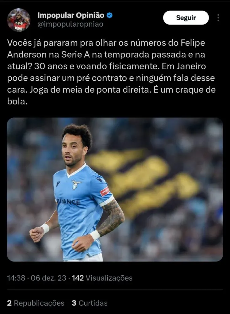 O ponta direita Felipe Anderson é um dos principais jogadores da equipe da Lazio, vestindo atualmente a lendária camisa 10 da equipe. Apesar da sua idolatria, a equipe não vive uma boa fase e sua permanência não é mais certeza.