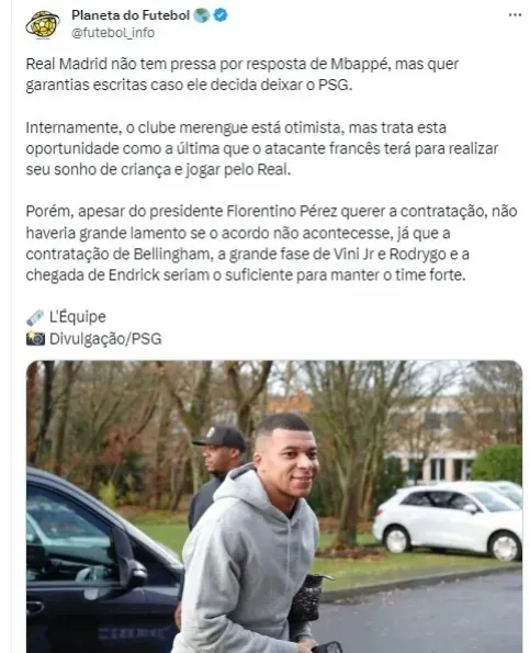 Apesar de ter se tornado capitão do PSG sob o comando do técnico Luis Enrique e aparentemente mais focado na equipe, Mbappé não deu garantias sobre seu futuro no clube francês. O Real Madrid, por sua vez, demonstra confiança em alcançar um acordo para contar com o talentoso jogador a partir da temporada 2024/25.