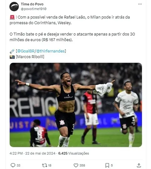 Wesley não chamou atenção apenas do Milan. Clubes como Real Betis e Atlético de Madrid, da Espanha, Brighton e Crystal Palace, da Inglaterra, também fizeram consultas sobre o jogador. Recentemente, o Corinthians recusou uma proposta do West Ham, da Premier League, devido a desacordos financeiros.