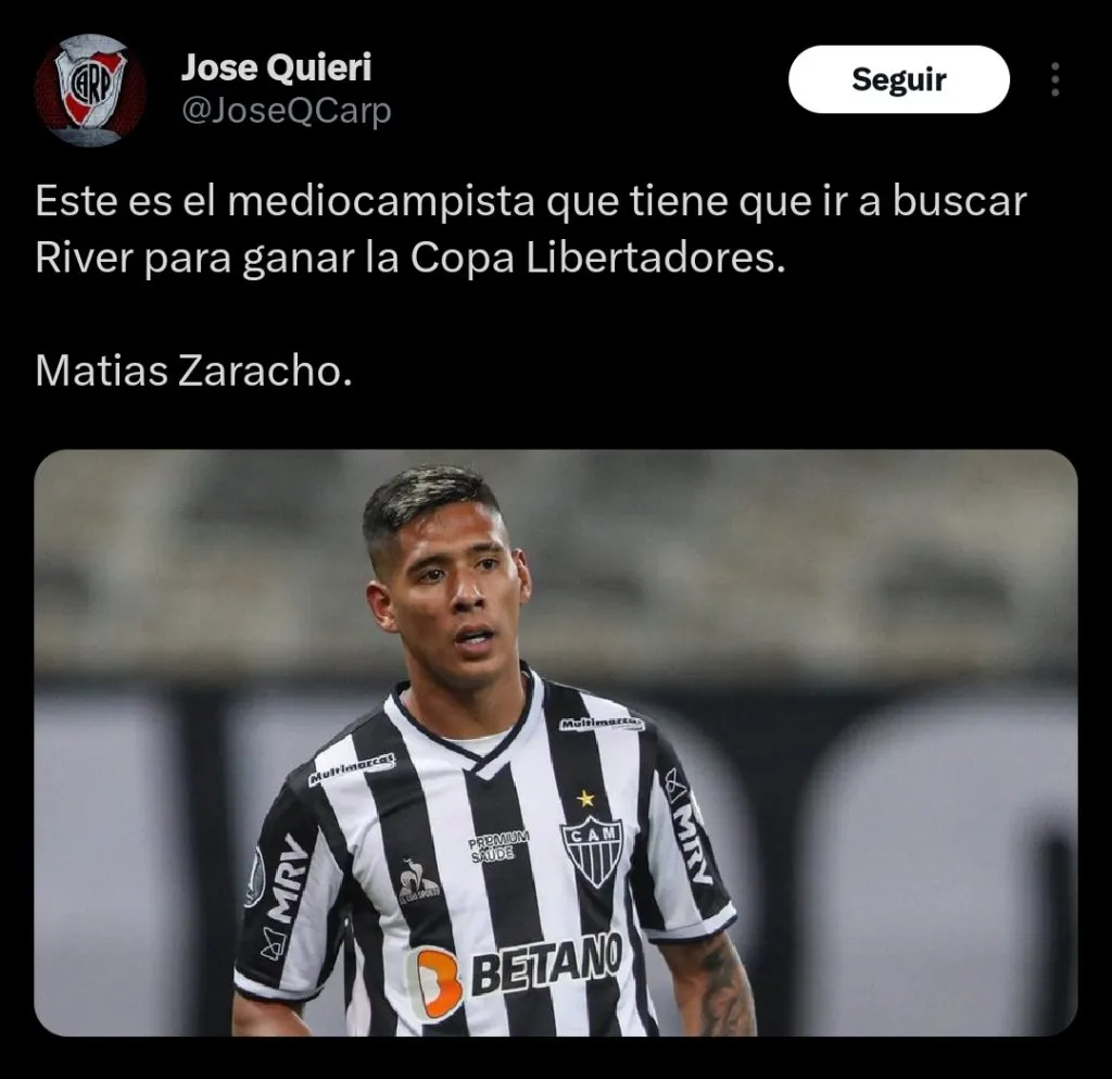 O jornalista Gustavo Yarroch informa que o River Plate tem um interesse gigante em poder contar com Zaracho em seu elenco.