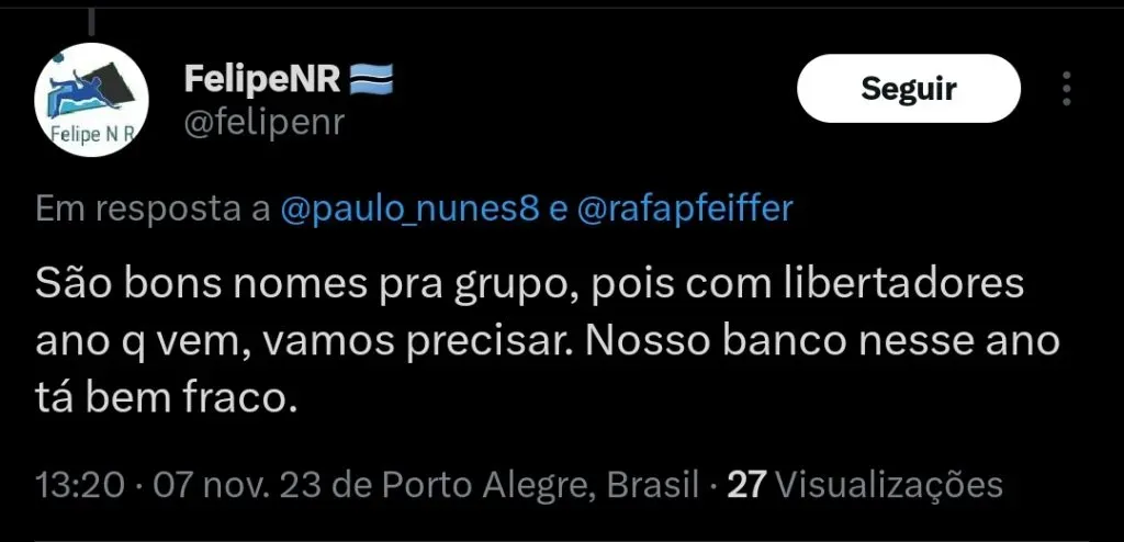 O clube gaúcho vem observando o jogador há bastante tempo, e tentou algumas vezes obter informações para uma possível contratação. A expectativa é que a diretoria do clube só avance nas tratativas após o término da temporada atual.
