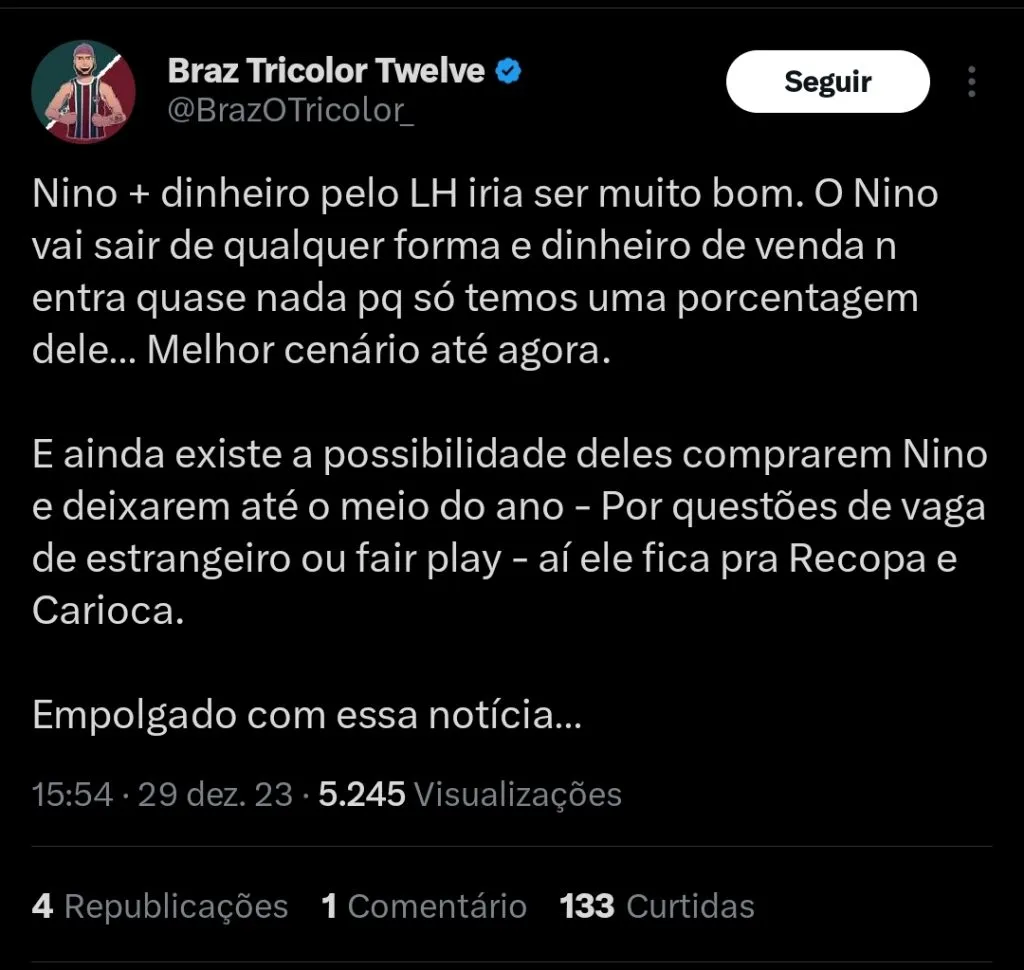 O zagueiro Nino foi um dos principais destaques do Fluminense na temporada 2023. Tendo grandes atuações ao longo do ano, o defensor foi peça chave nas conquistas dos títulos do tricolor, e acabou virando ainda mais ídolo da torcida.