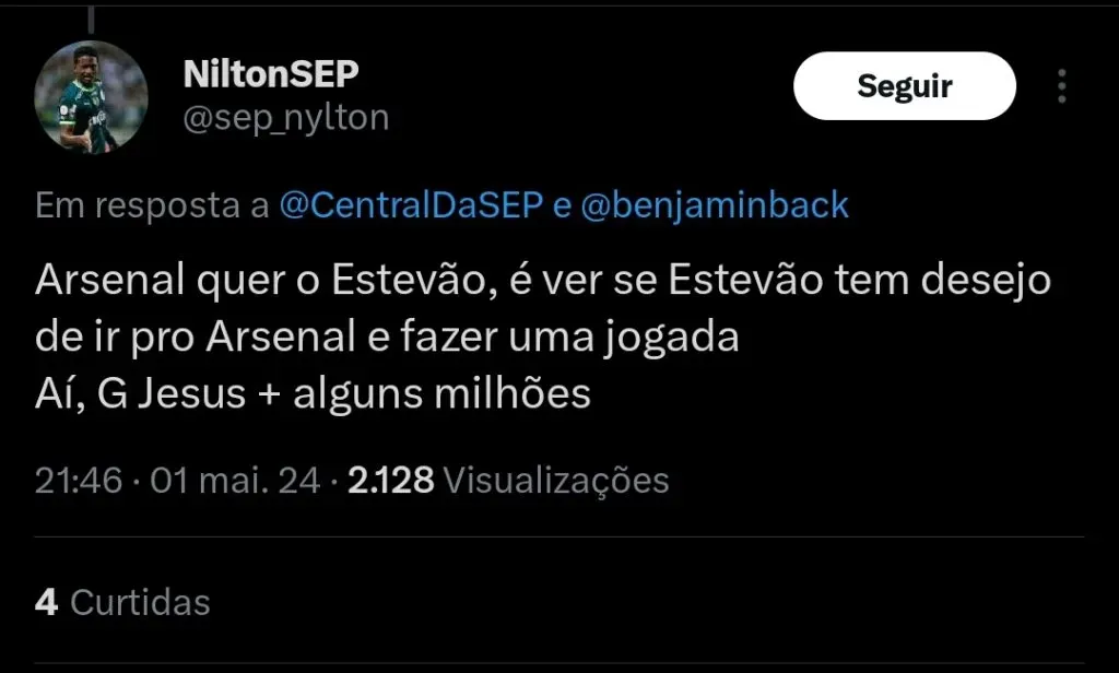 Quem está na briga pela chegada do jogador, é o Palmeiras, que tem buscado a chegada de um substituto para Endrick.