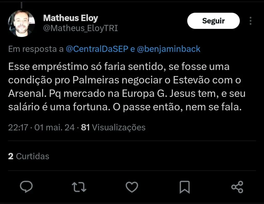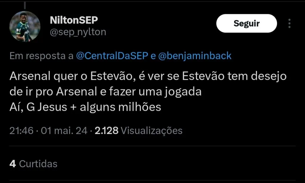 O jornalista Benjamin Back informa que o Palmeiras tem grande interesse na repatriação do atacante Gabriel Jesus.