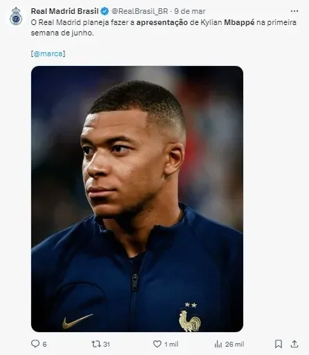 A expectativa é que Mbappé seja apresentado na segunda semana do mês, após o retorno da equipe do torneio de pré-temporada do Real Madrid nos Estados Unidos.