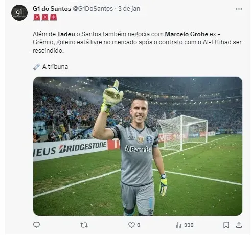 O Santos está ativo no mercado em busca de reforços para a posição de goleiro e mantém conversas com dois nomes: Tadeu, do Goiás, e Marcelo Grohe, ex-Grêmio, atualmente de saída do Al-Ittihad, da Arábia Saudita.