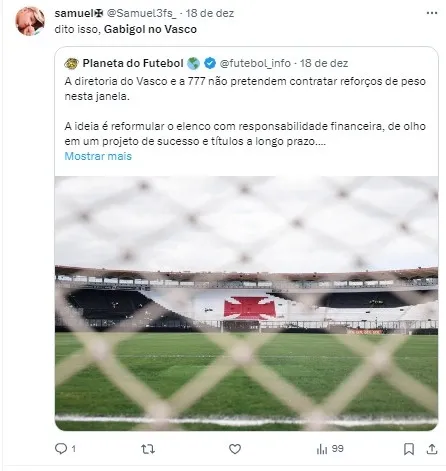 “Tem jogadores no mercado que o Vasco poderia ir atrás. Nem falo do De La Cruz, mas do Scarpa, do Viña, do próprio Gabigol, por que não? É claro que o Flamengo, para o Vasco, dificultaria essa negociação, mas se o Corinthians pensa em contratar… o São Paulo está se mexendo bem no mercado”, disse.