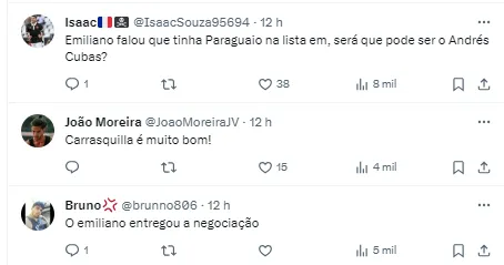 Dois nomes entraram na mira do clube: o volante paraguaio Andrés Cubas e o meia panamenho Adalberto Carrasquilla. Os jogadores foram oferecidos ao clube, segundo informações dos jornalistas Cristian Moraes e Tiago Brandão.