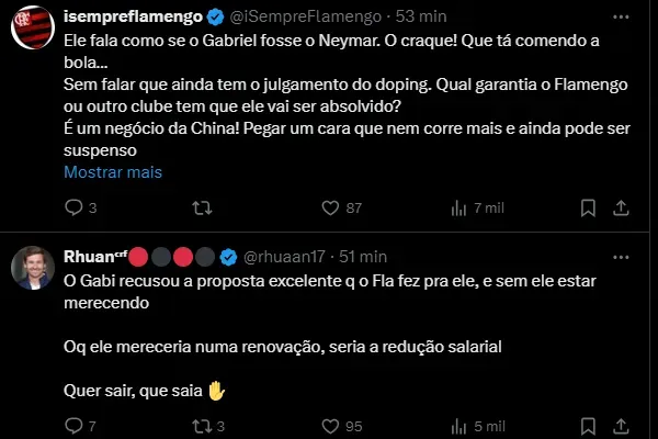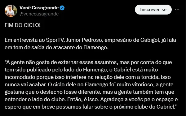 “A gente não gosta de externar esses assuntos, mas por conta do que tem sido publicado pelo lado do Flamengo, o Gabriel está muito incomodado porque isso interfere na relação dele com a torcida”, disse Junior.
