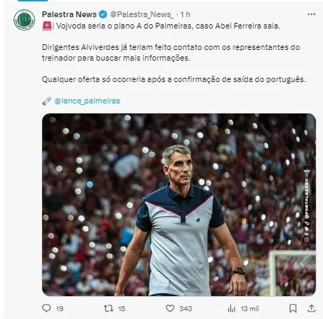 Segundo o portal “Palestra News”, representantes do clube já teriam iniciado conversas com os representantes de Juan Pablo Vojvoda, atual treinador do Fortaleza, buscando informações sobre uma possível sucessão.
