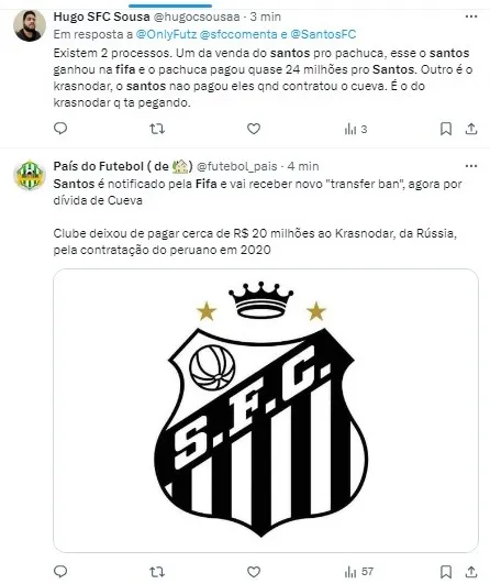 Segundo informações do GE, o Peixe recebeu uma notificação da entidade máxima do futebol informando sobre a pendência de US$ 4 milhões (cerca de R$ 20 milhões) referentes à contratação do meio-campista peruano Christian Cueva em 2020.