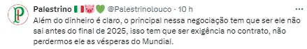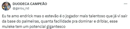 “Minha cabeça está 100% no Palmeiras. Não penso nisso. Só em como eu vou dar o meu melhor e como ajudar o Palmeiras. Isso fica em segundo plano. Tento ao máximo me esforçar em campo para dar alegrias à torcida palmeirense”, disse o Estêvão após a goleada sobre o Liverpool (URU), pela Libertadores, na última quinta (9).