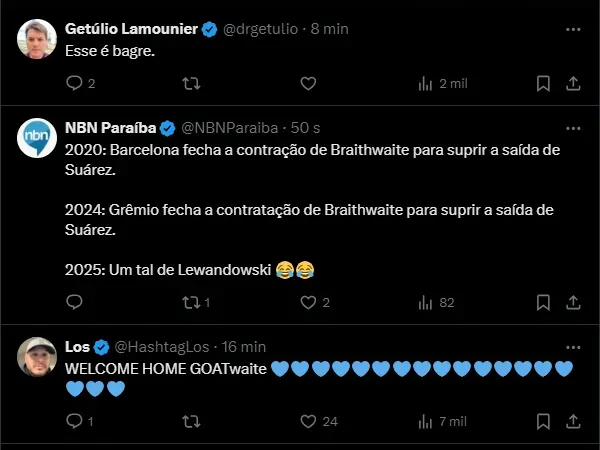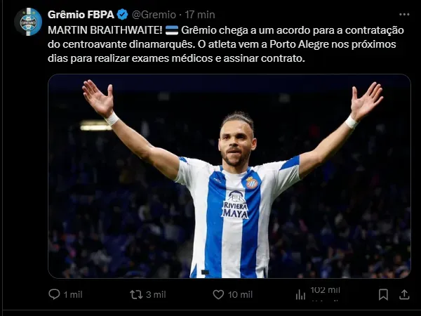 Agora, o Tricolor avançou e conseguiu com que Braithwaite topasse pousar no Brasil para defender as cores da equipe de Porto Alegre. Faltam os exames médicos serem realizados.