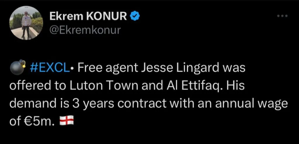 Segundo informações do jornalista Ekrem Konur, o meia Jesse Lingard, atualmente sem clube, teria sido oferecido ao Luton Town, recém promovido para a Premier League.