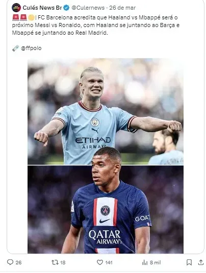 De acordo com o jornal “Sport”, o presidente do Barcelona, Joan Laporta, estaria interessado em contar com os serviços de Haaland. Laporta já teria até mesmo se reunido com a empresária do jogador, Rafaela Pimenta, alimentando os rumores de uma possível transferência para o clube catalão.