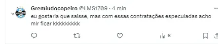 Mas, ainda segundo o jornalista, há dificuldade de repor o jogador e isso pode ser uma barreira para a saída do jogador. Apesar do alto salário, a manutenção é considerada uma opção mais barata. Ou seja, com o valor recebido, o Grêmio imagina que não conseguiria contratar um jogador com qualidade semelhante ou superior de Ferreirinha.