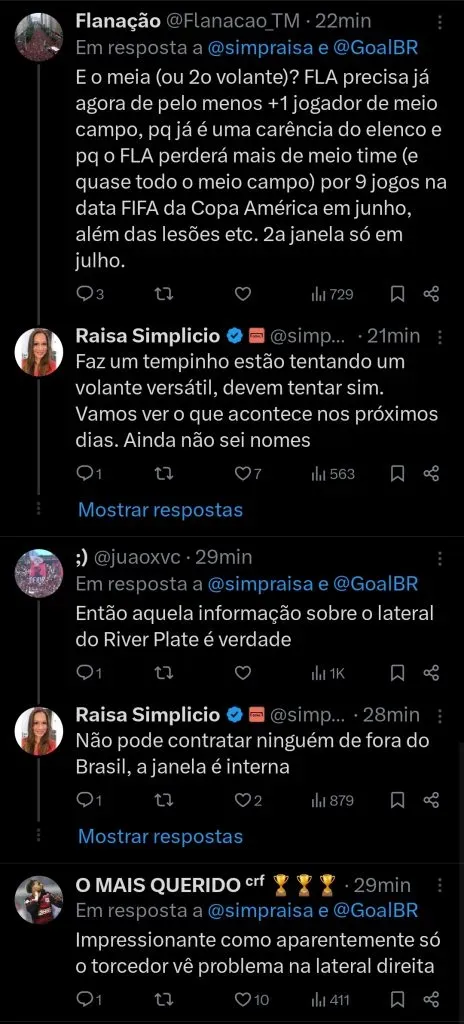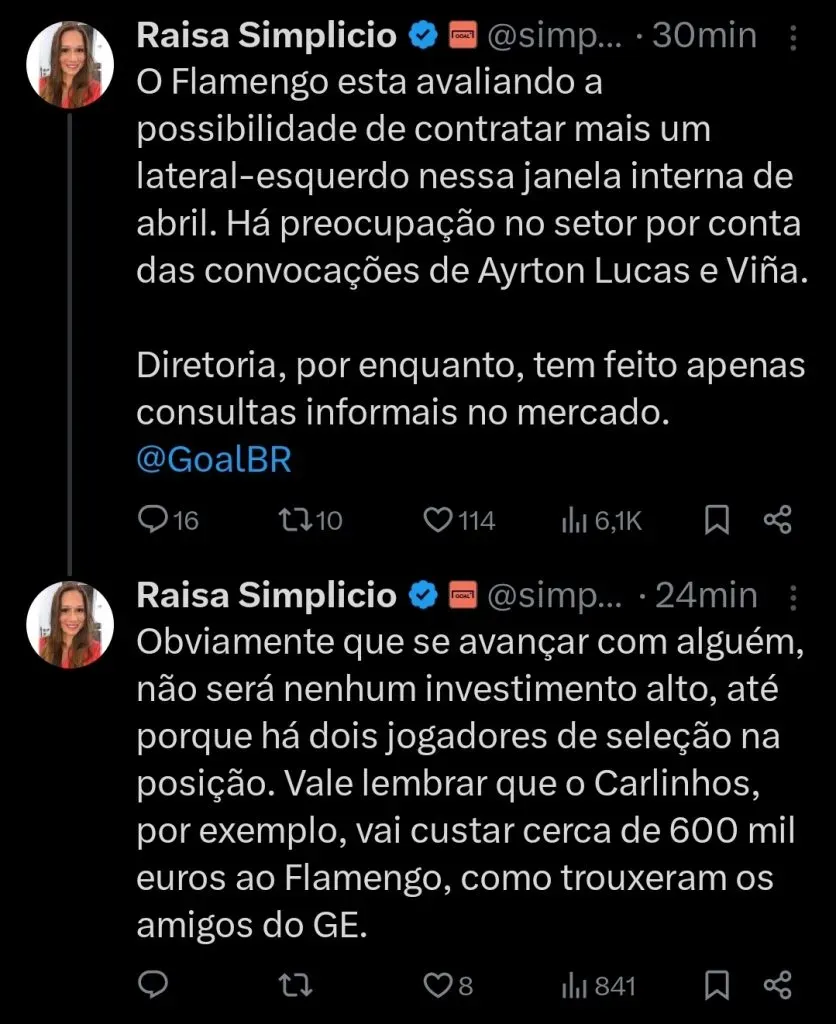 A saída que o Mengão encontra para não sofrer na esquerda é contratar mais um lateral, segundo a jornalista Raisa Sinplicio na tarde desta segunda-feira (1).