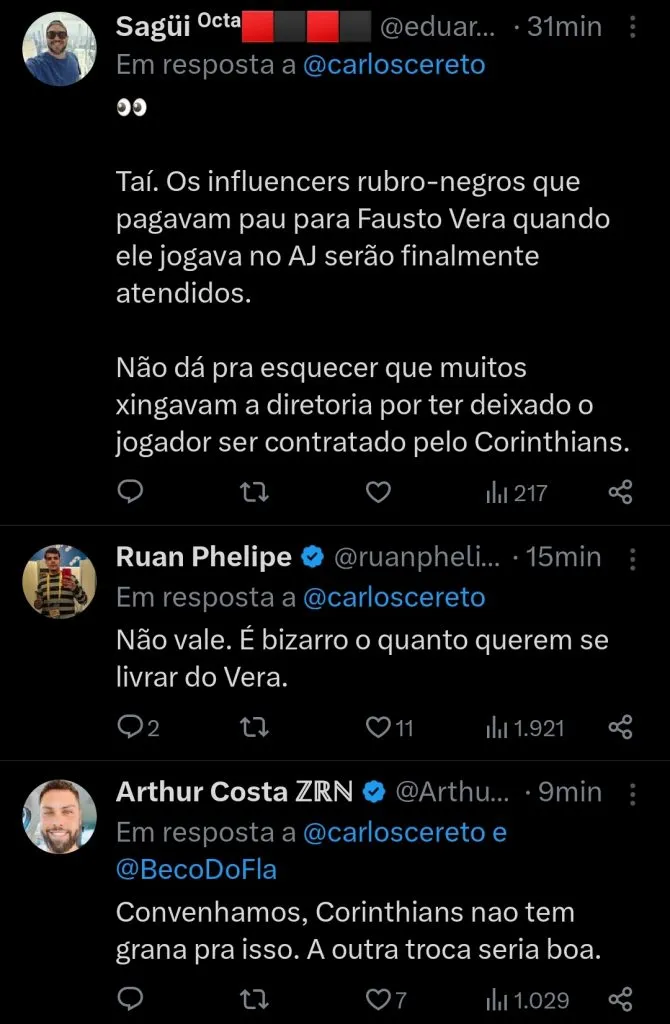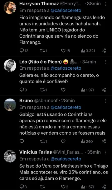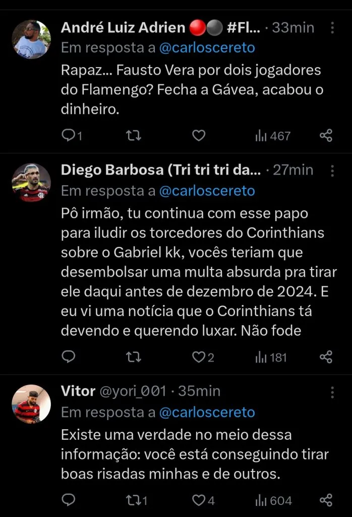 “Informação: O Corinthians continua MUITO interessado em contratar Gabigol do Flamengo. Já há conversas nos bastidores entre as duas diretorias. Mais do que isso, o Corinthians negocia uma troca envolvendo Fausto Vera por Matheusinho e Thiago Maia. A troca está avançada”, crava.