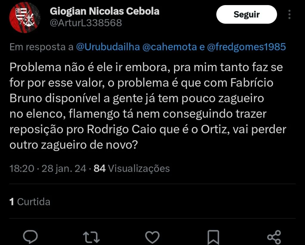 De acordo com o jornalista Cahê Mota, o Flamengo recebeu uma proposta milionária pelo zagueiro Fabricio Bruno.