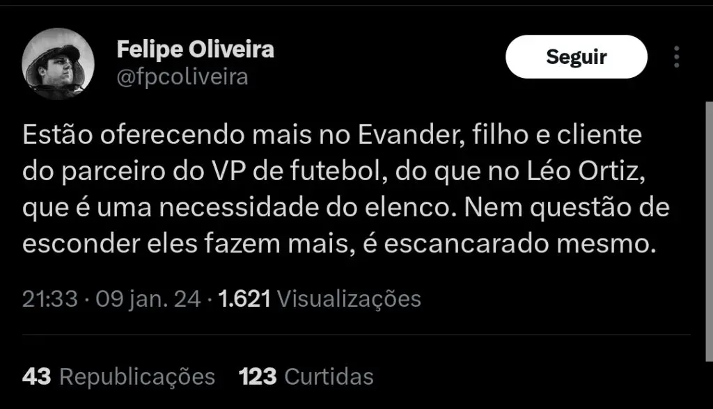 O jornalista Venê Casagrande reporta que o Flamengo realizou uma proposta oficial pela contratação do meia Evander.
