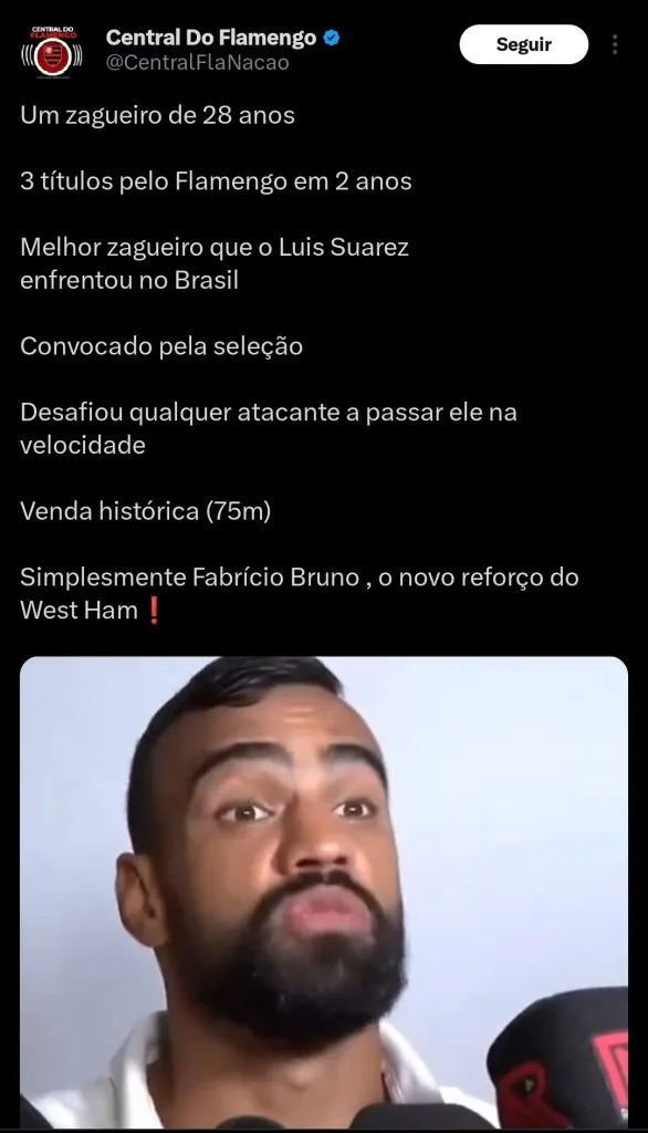 O jornalista Fabrizio Romano, através das suas redes sociais, divulgou que Flamengo e West Ham chegaram a um acordo por Fabrício Bruno.