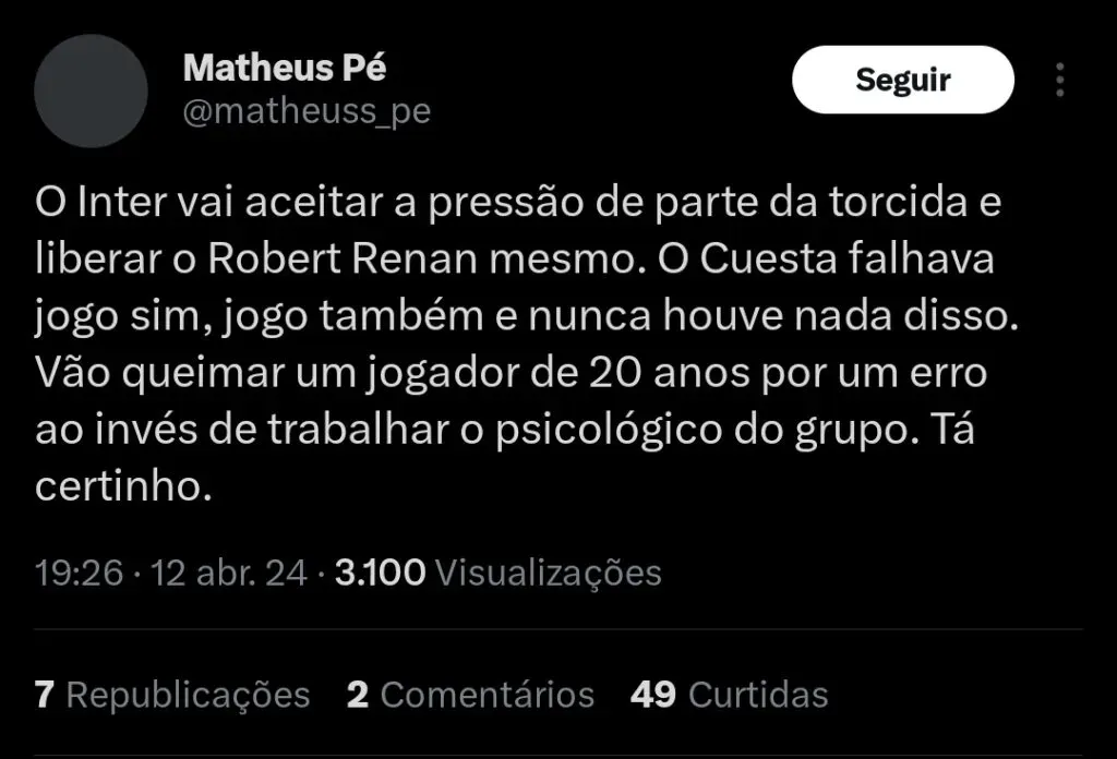 O zagueiro Robert Renan chegou com grandes expectativas no Internacional, mas acabou perdendo espaço na equipe recentemente.