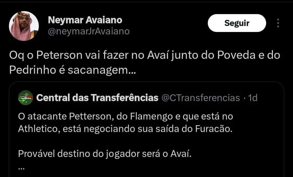 O jornalista João Bianchi informa que o Avaí negocia a contratação do atacante Petterson, que pertence ao Flamengo.