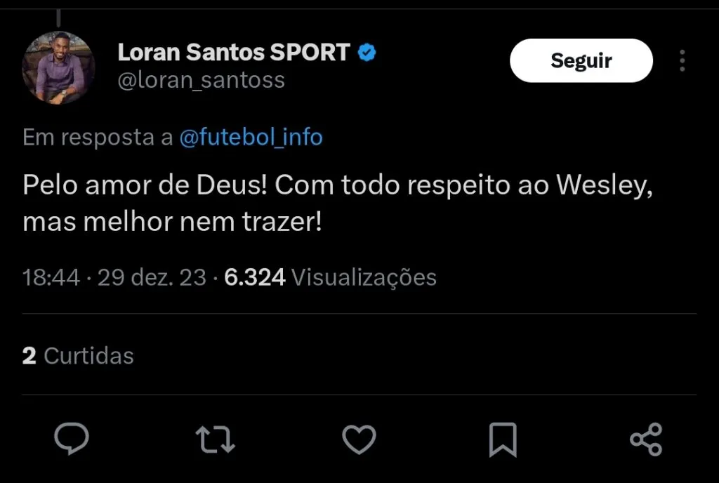 O GE informa que o Vasco da Gama tem grande interesse em acertar a contratação de Wesley para a disputa da próxima temporada do futebol brasileiro.
