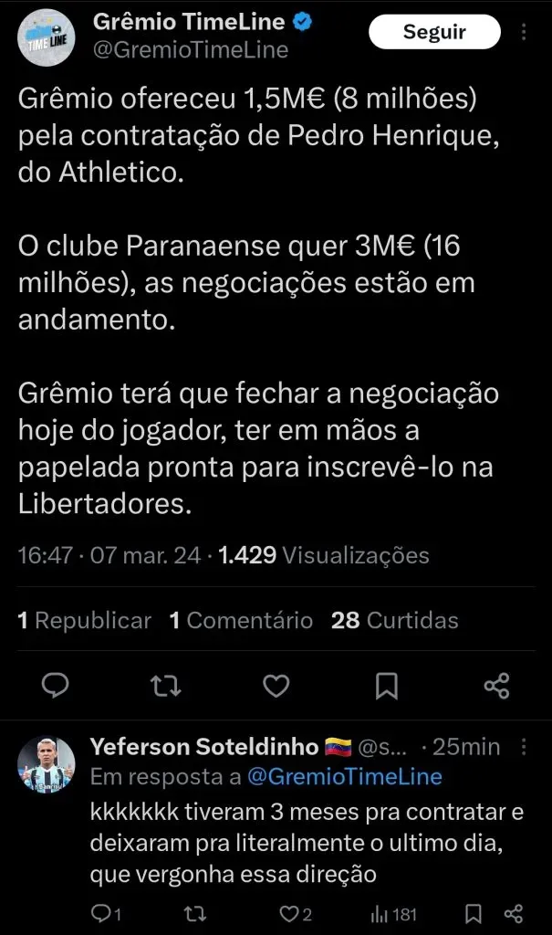 A direção do Rubro-Negro não dá o braço a torcer e pede o dobro da quantia para que Pedro Henrique seja jogador do Grêmio nesta temporada. As informações são do perfil Grêmio TimeLine (@GremioTimeLine).