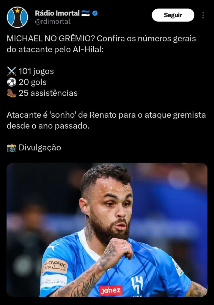 O jornalista Bruno Gomes informa que o Grêmio quer fazer uma nova investida pela contratação do atacante Michael, do Al Hilal.