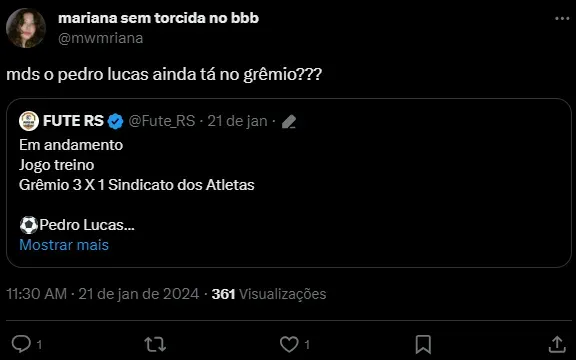 “Fora dos planos do Grêmio, o meia Pedro Lucas foi oferecido ao Vitória nos últimos dias. O jogador já foi comunicado que não faz parte do planejamento da comissão técnica para a temporada 2024”, destaca a atualização.
