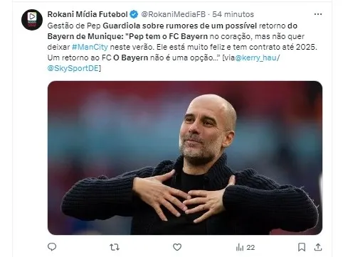 “Pep Guardiola tem o Bayern no coração, mas não quer deixar o Manchester City neste próximo verão. Está muito feliz e tem contrato até 2025, voltar ao Bayern não é uma opção”, declarou o comunicado.