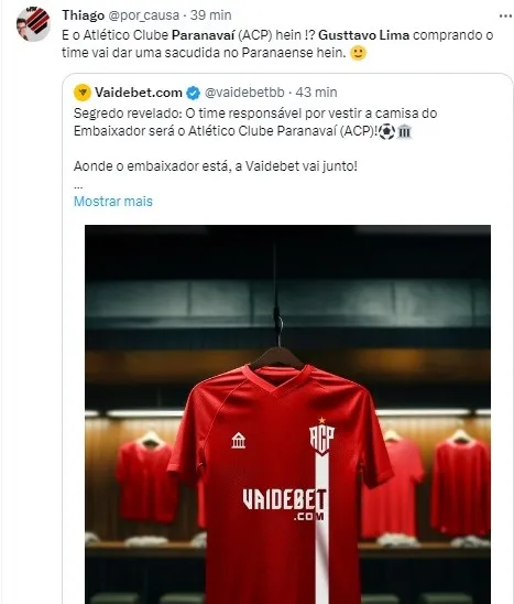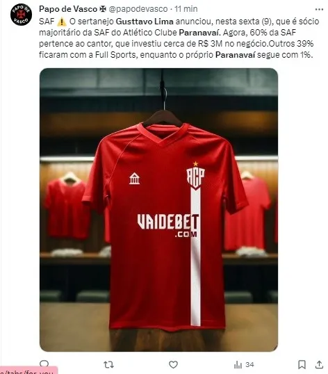 Vale ressaltar que Gusttavo Lima assumiu o papel de embaixador da “VaiDeBet”, uma empresa de apostas esportivas que recentemente se tornou o novo patrocinador máster do Corinthians, em um contrato milionário de três anos, estimado em R$ 370 milhões.