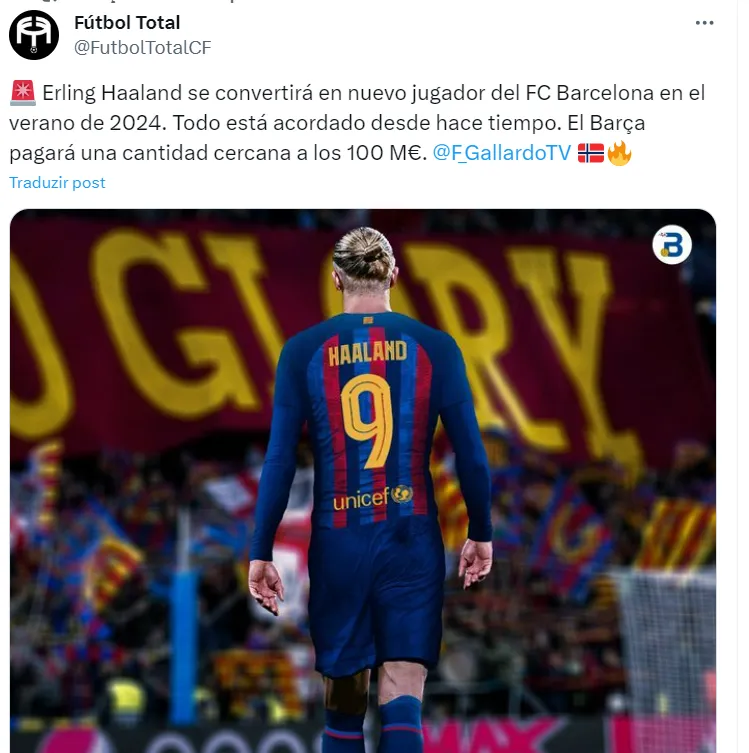 O jornalista espanhol François Gallardo pegou todo mundo de surpresa ao anunciar durante um programa esportivo na Espanha que Haaland será reforço do Barcelona no verão europeu deste ano, ou seja, em julho.