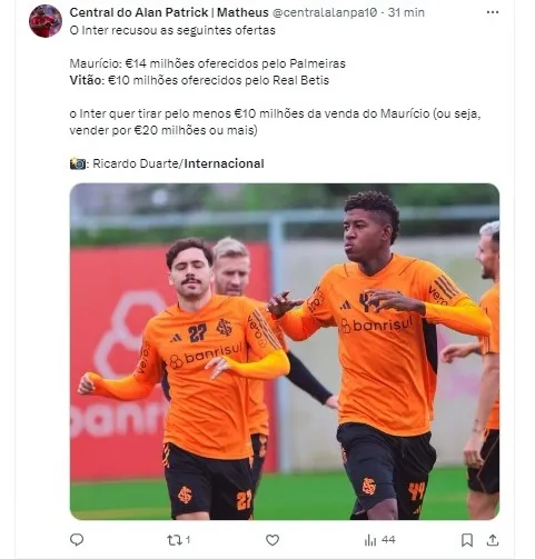 O clube recusou uma oferta de 9 milhões de euros (aproximadamente R$ 49,7 milhões) do Real Betis, da Espanha, pelo zagueiro Vitão, de 24 anos. A diretoria do Colorado acredita que pode conseguir um valor mais alto em futuras negociações.