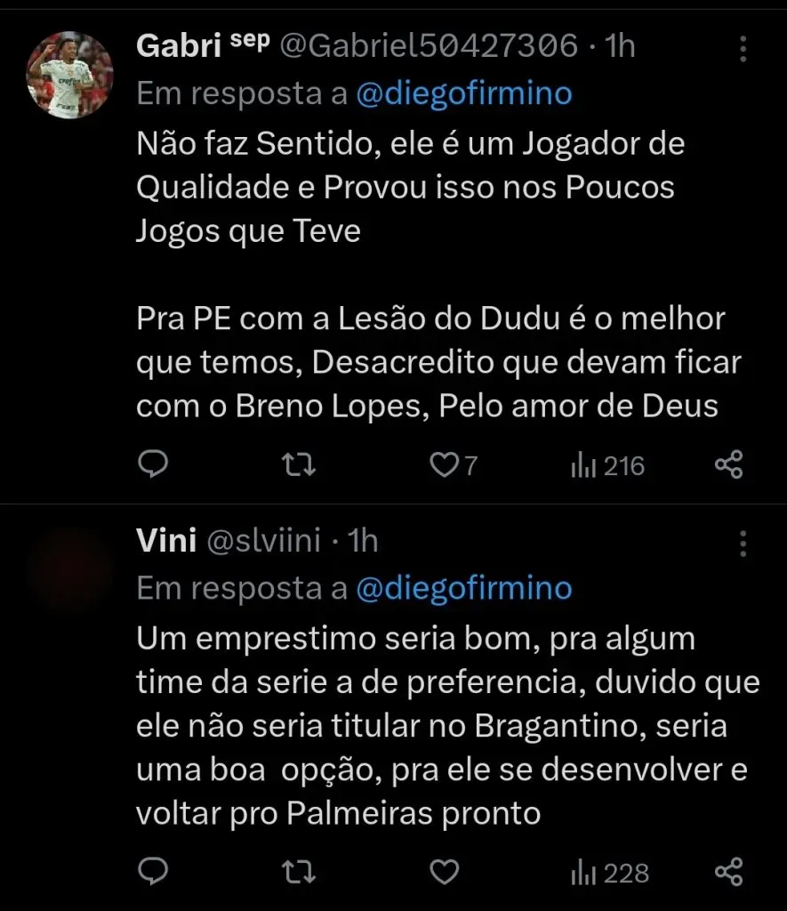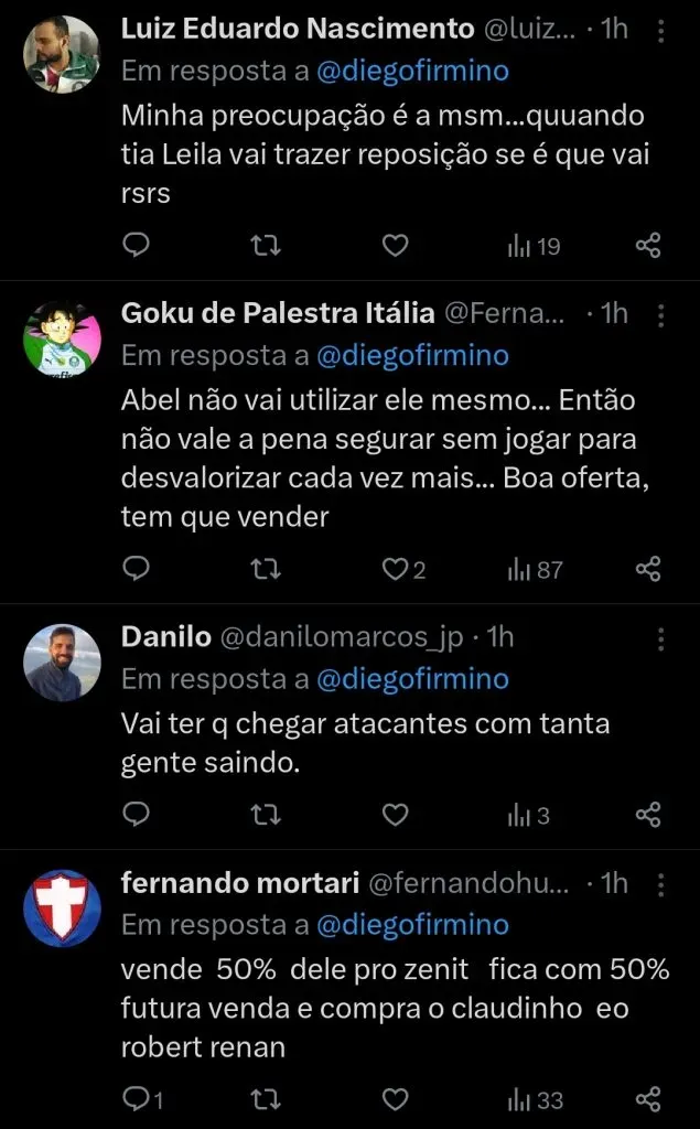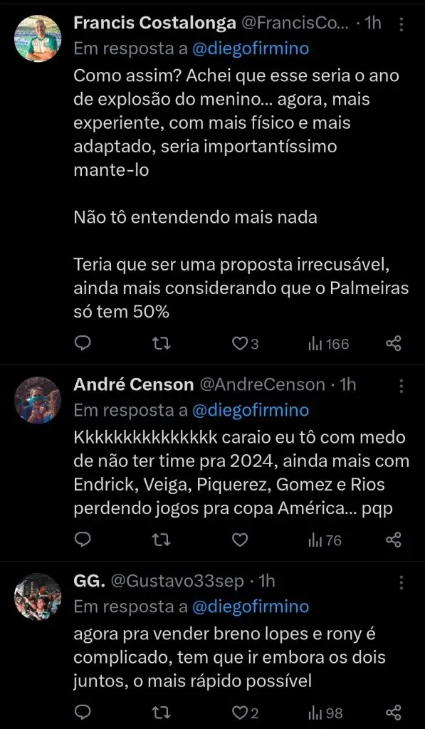 Jogador não deve permanecer no Palmeiras em 2024. Vamos aguardar”, sinaliza Diego Firmino, no Twitter.